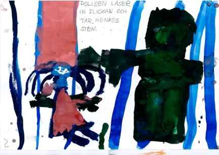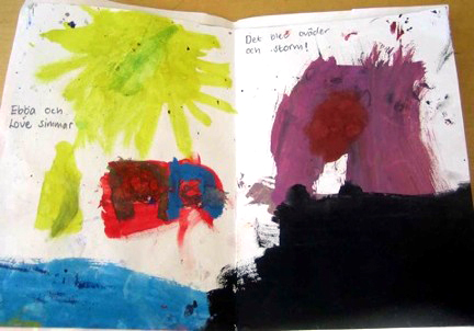 Spännande också att se resultatet ur vuxenkonstnärlig synvinkel: Nedanstående bild skulle vara ett obestämt krafs utan sin text - nu är den ett explosivt åskväder.