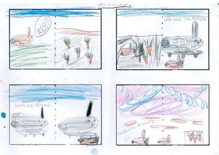 Ledamöternas krönikor Vecka 16 2012 I serien "workshops" av Anna Bengtsson Jag har provat ett bilderbokskoncept på olika åldersgrupper, senast sexåringar i Falun i våras. Meningen är att berättelsen ska göras i både text och bild och det ska göras individuellt (med hjälp av vuxen). Slutresultatet ska bli en bok i dummyform. Temat till sexåringarna blev resor, ett ämne som ger oändliga möjligheter till historieberättande, vilket förresten de flesta ämnen gör i lägre åldrar. Vi diskuterade vilken sorts huvudperson man kan tänka sig och vad man kan resa med. Kanske vi borde ha diskuterat resmålet men jag tänkte att det skulle låsa berättelsen och att det var bättre att få en start och se vartåt det barkade. Resor kan ju betyda väldigt olika saker. I första omgången enkla skisser i litet format, med text om man ville och kunde, i färdiga rutor uppslagsvis. I ett senare stadium större format och lite mer utvecklad berättelse. Uppgiften var avancerad för sexåringar och krävde hjälp av lärarna.